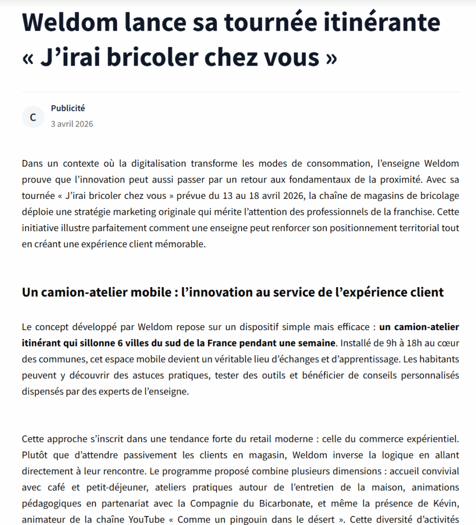 "Weldom lance sa tournée itinérante « J’irai bricoler chez vous »" - 03/04/26 - Franchise Magazine